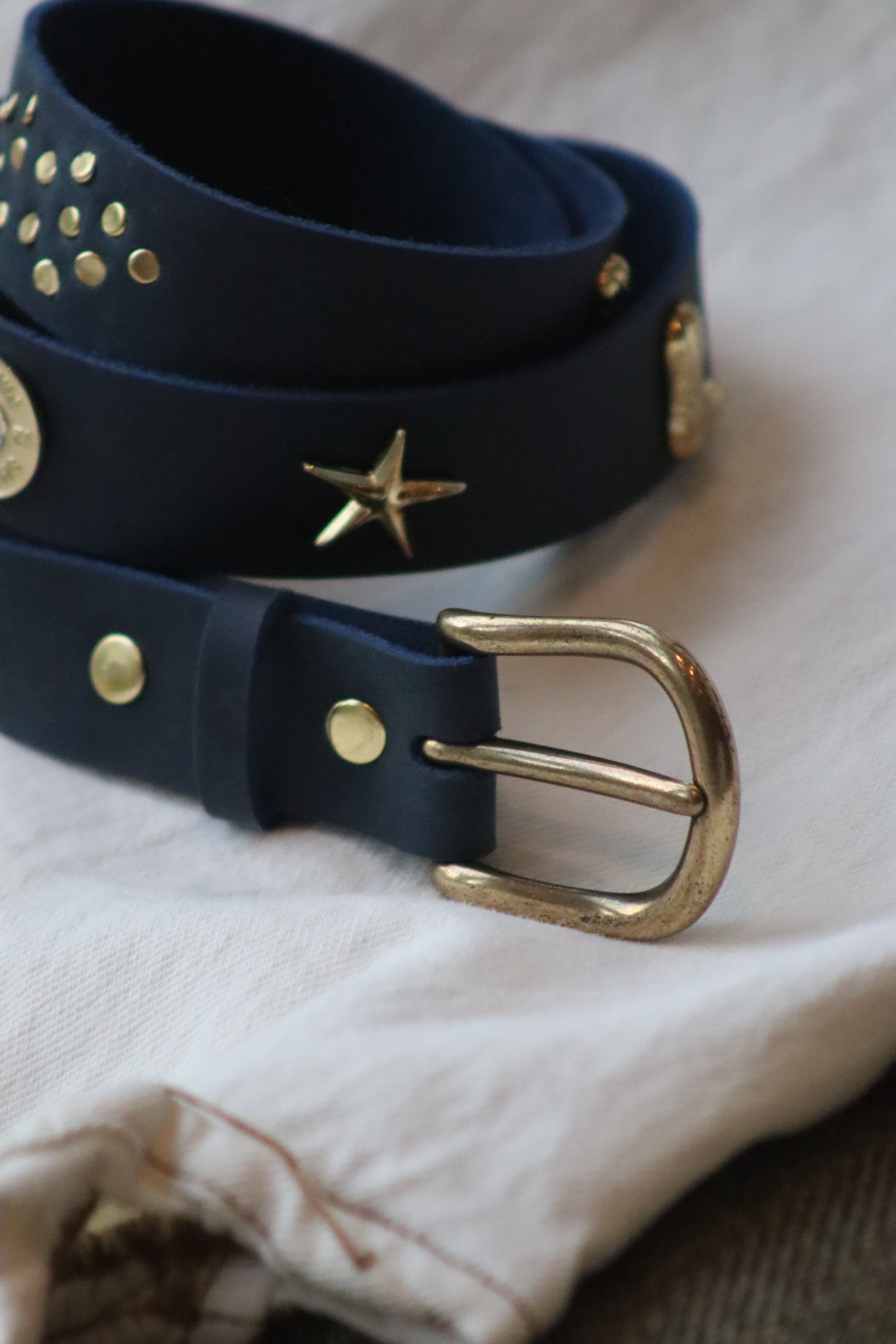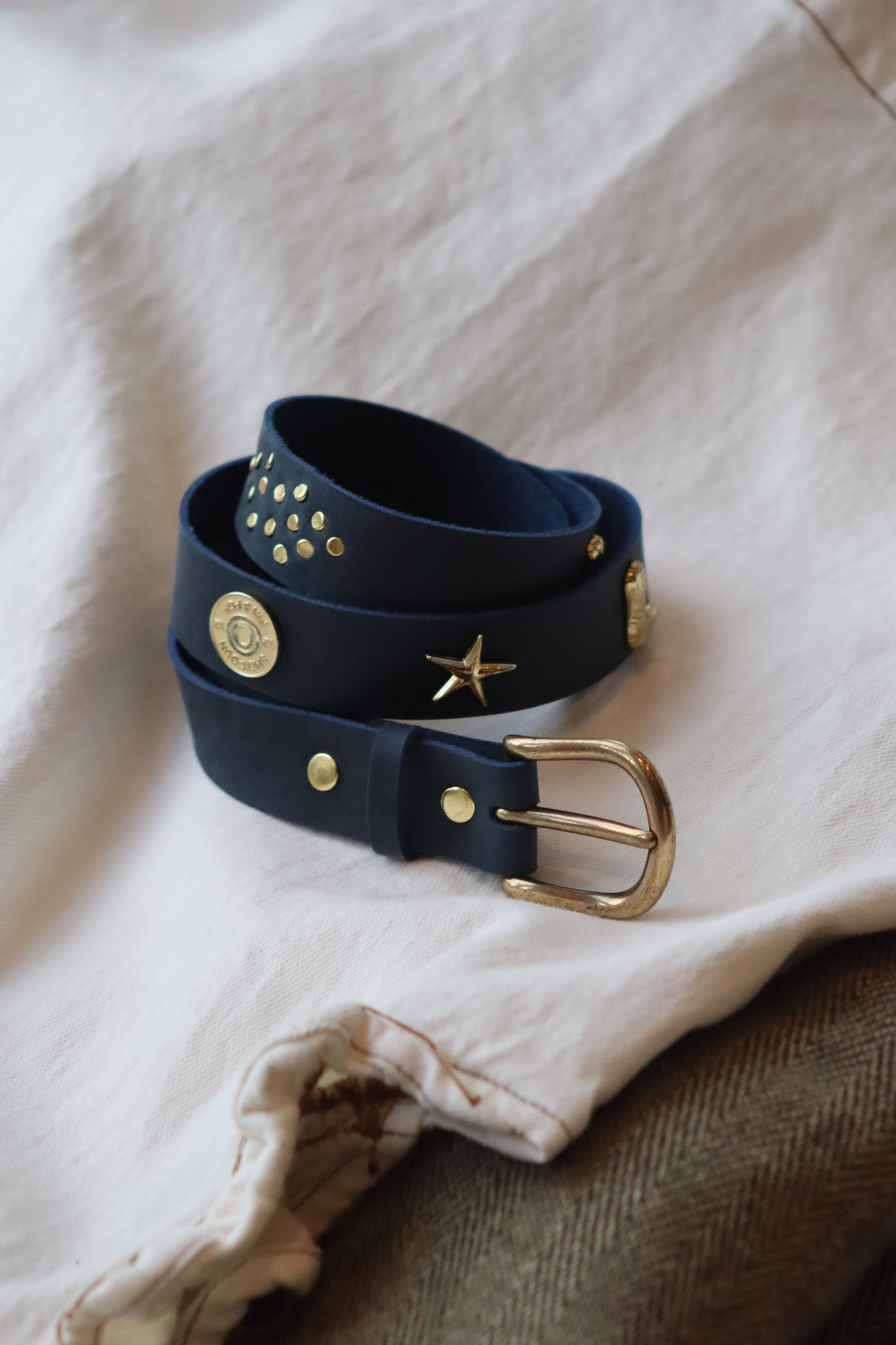 Handmade in England from South African cow leather. Each belt comes with your choice of sis gold charms (Western Boot, Star, or Cartridge Cap), with the option to purchase charms separately for further customisation.